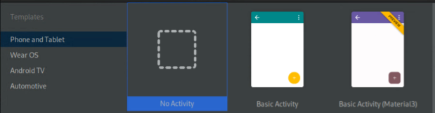 Para criar um novo projeto, selecione File > New > New Project. Selecione No Activity em vez de Empty Activity, porque os pacotes RRO contêm apenas recursos.