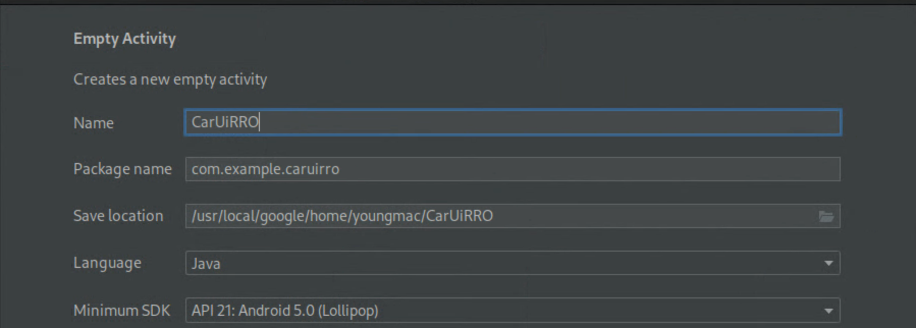CarUiCodelabao app e selecione a linguagem Java. Você também pode selecionar um local de arquivo, se quiser. Aceite os valores padrão para as demais configurações.