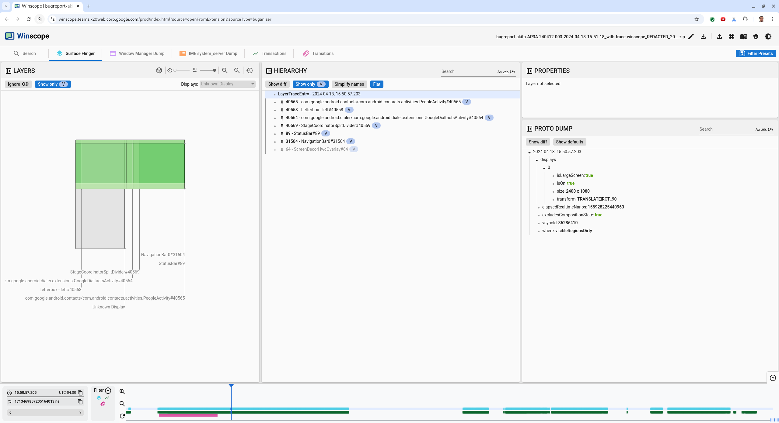 5. O ana gitmek ve Surface Flinger sekmesindeki dikdörtgenleri doğrulamak için Gönderme Zamanı sütunundaki bağlantıyı (bu örnekte 2024-04-18, 15:50:57.205) tıklayın. Geçişi doğru ok tuşuyla adım adım ilerleyerek ve dikdörtgenleri gözlemleyerek geçiş sırasında cihazın durumunun doğruluğunu onaylayın.