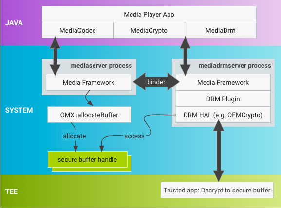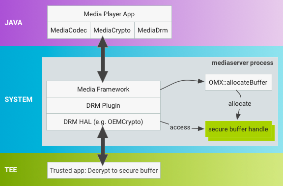 在 Android 7.0 中,緩衝區配置程序已變更為新機制,可提供彈性,同時盡量降低對現有實作項目的影響。在新的 mediadrmserver 程序中,MediaDrm 和 MediaCrypto 堆疊會以不同的方式分配緩衝區,且廠商必須更新安全緩衝區句柄,以便在 MediaCodec 對 MediaCrypto 叫用解密作業時,透過繫結器傳輸緩衝區。