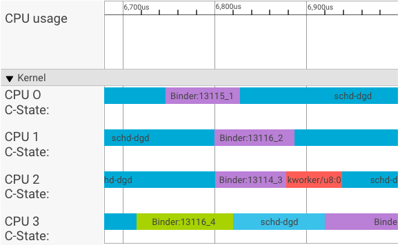 • Transaksi pertama kemudian dimulai oleh fifo-caller. Untuk melayani transaksi ini, hwbinder mengupgrade prioritas server (pid: 8674 tid: 8676) menjadi 99 dan juga menandainya dengan class penjadwalan sementara (dicetak sebagai ???). Penjadwal kemudian menempatkan proses server di CPU:0 untuk dijalankan dan menyinkronkannya dengan CPU yang sama dengan kliennya.