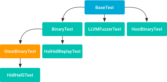 En VTS, el formato de prueba predeterminado son las pruebas de Python del host que se extienden desde BaseTest en el ejecutor de VTS. Para integrar pruebas del destino, primero debes enviar los archivos de prueba al dispositivo, ejecutar las pruebas con comandos de shell y, luego, analizar los resultados con secuencias de comandos de Python del host.